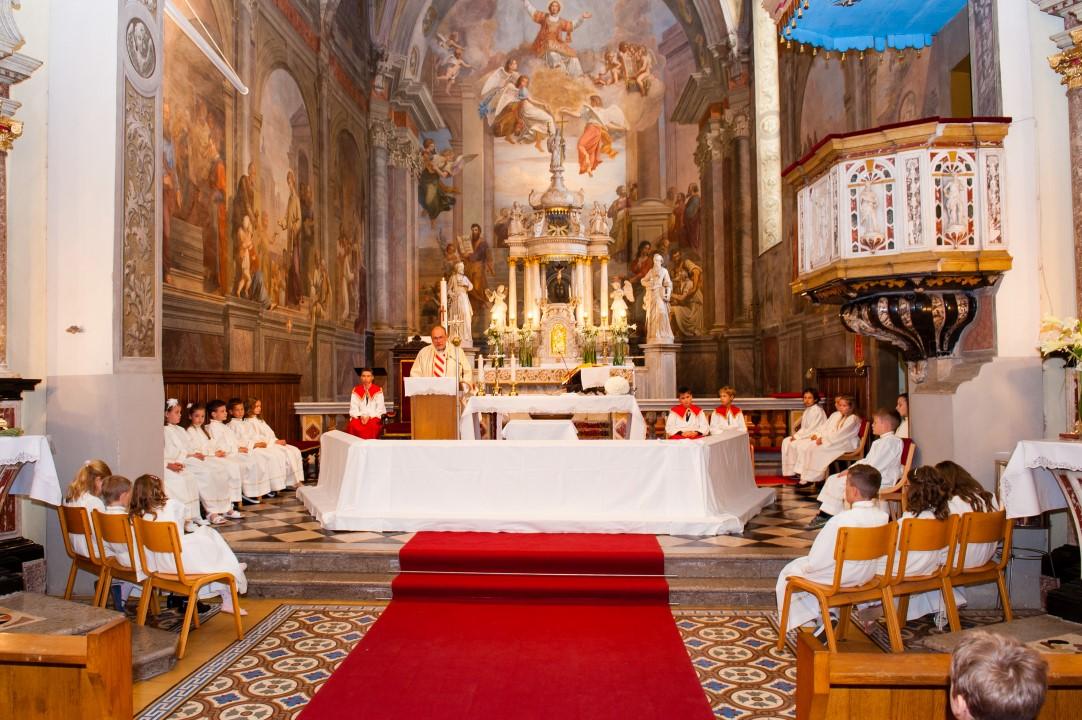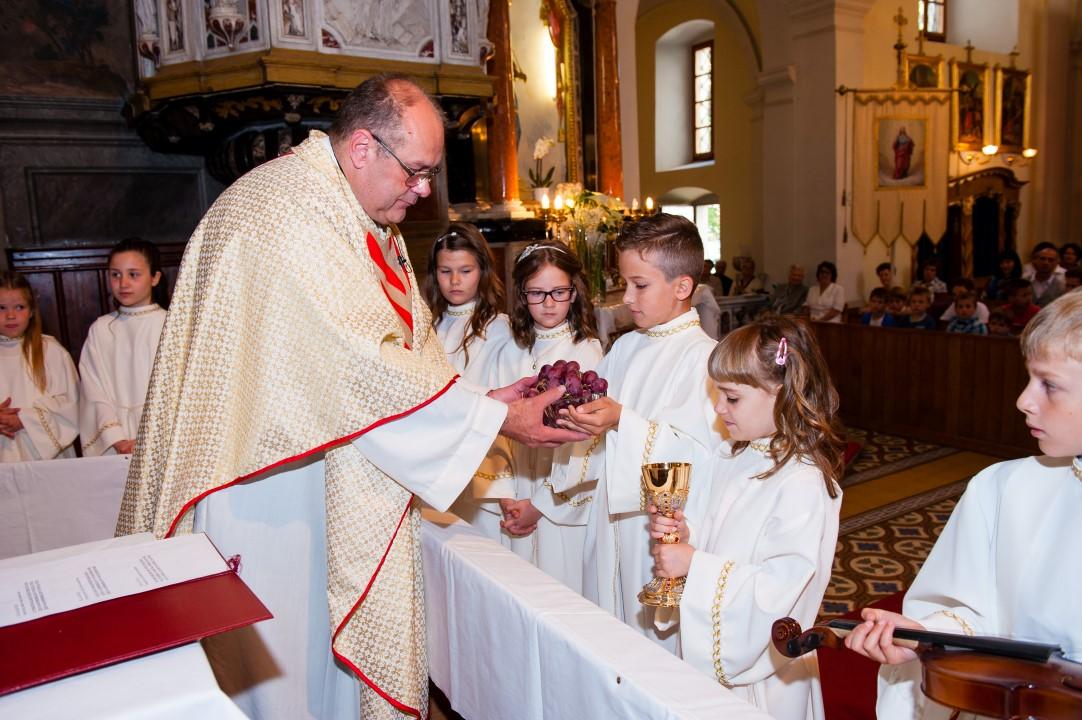 Po tem, ko so teden pred tem pri sveti spovedi prvič očistili svoja srca, so pri nedeljski maši oblečeni v bela oblačila (haljice) slovesno v sprevodu vkorakali v cerkev. Razporejeni okrog oltarne mize so s prošnjami, darovi, zahvalami in petjem prisrčno sooblikovali bogoslužje ter prejeli prvo sveto obhajilo.