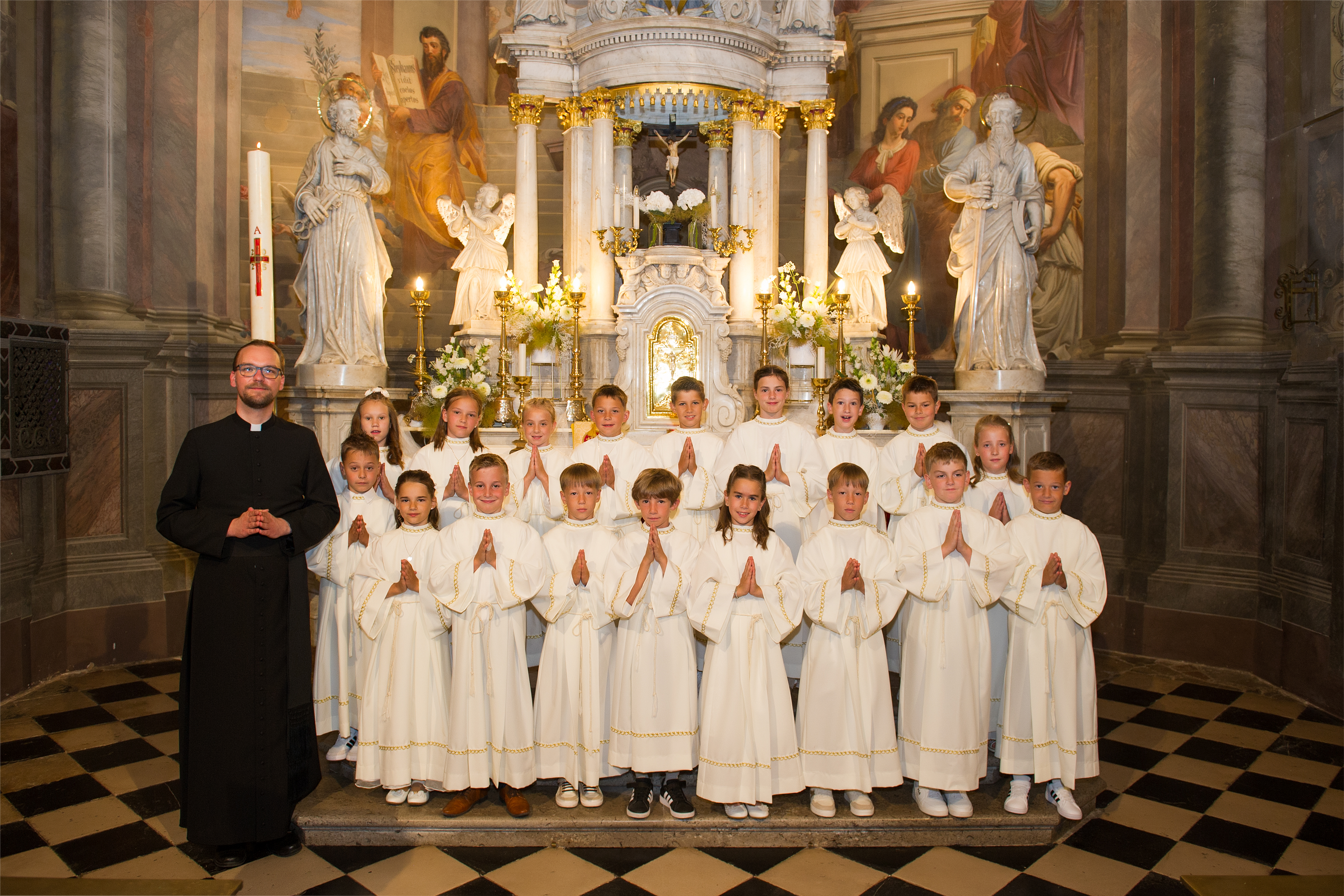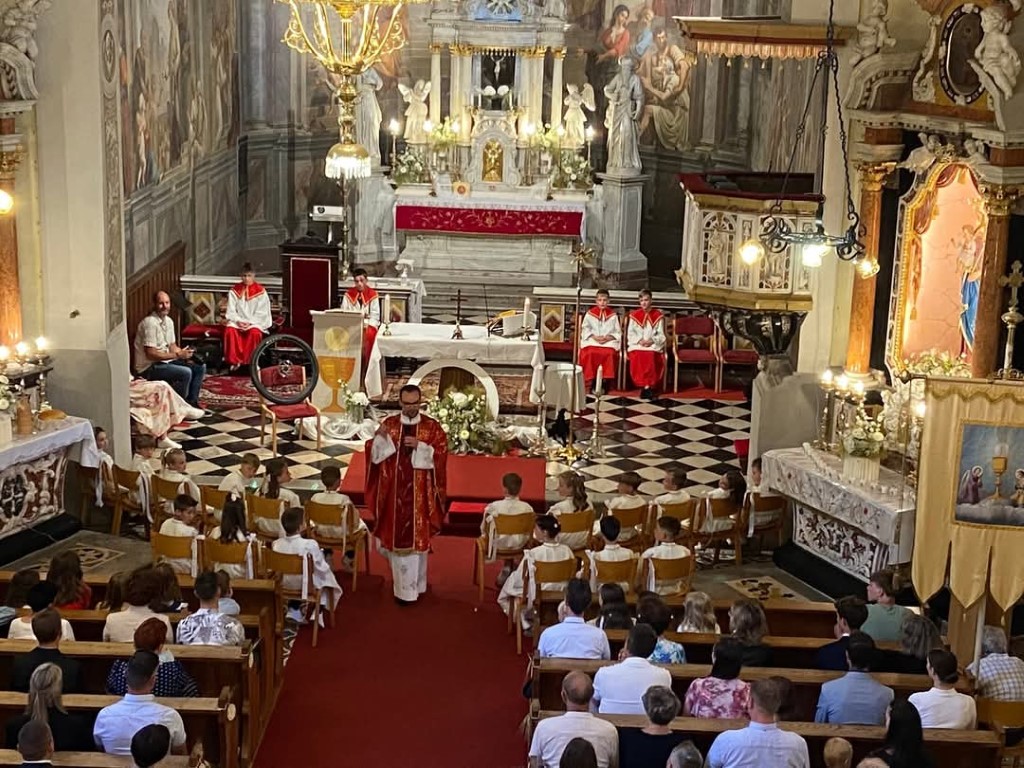 Dogodek se je začel s slovesno sveto mašo, ki jo je vodil župnik Gabriel Kavčič. Cerkev je bila praznično okrašena, otroci pa so s svojo prisotnostjo in nasmehi napolnili prostor s preprostostjo, iskrenostjo in veseljem. V belih oblačilih, ki simbolizirajo čistost srca, so s stopili pred oltar, pripravljeni, da sprejmejo Jezusa v svoje življenje.