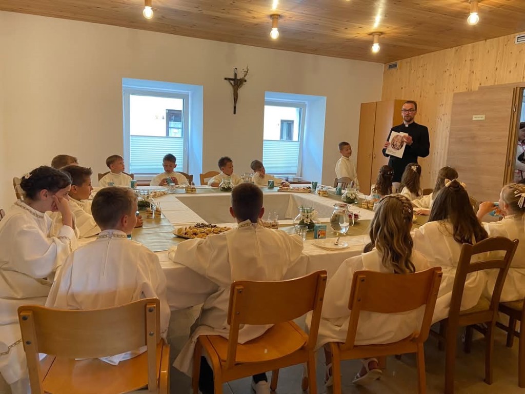Kot se za slavje spodobi, smo ga zaključili z manjšo pogostitvijo v cerkveni hiši. Otroci so tam prejeli tudi droben spomin na prvo sveto obhajilo.